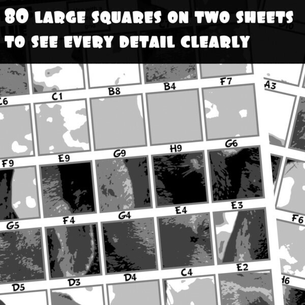 A HARD VERSION made up of black, dark gray, gray, light gray, and white shapes, and comes in a normal and extra detailed version.